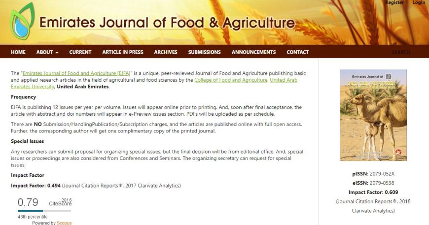 Customer: United Arab Emirates University Category: OJS Development Impact Factor: 1.1 eISSN: 2079-0538 Share: Emirates Journal of Food and Agriculture The “Emirates Journal of Food and Agriculture [EJFA]” is a unique, peer-reviewed Journal of Food and Agriculture publishing basic and applied research articles in the field of agricultural and food sciences by the College of […]