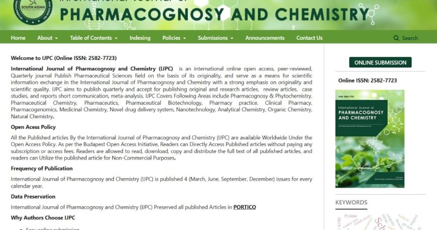 Customer : PHARMACOGNOSY AND CHEMISTRY Category : OJS, Development Online ISSN : 2582-7723 Share: International Journal of PHARMACOGNOSY AND CHEMISTRY International Journal of Pharmacognosy and Chemistry (IJPC) is an international online open access, peer-reviewed, Quarterly journal Publish Pharmaceutical Sciences field on the basis of its originality, and serve as a means for scientific information exchange in […]