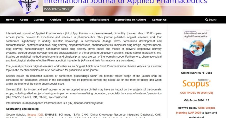 Customer : International Journal of Applied Pharmaceutics Category : OJS Development CITESCORE 2024 : 1.7 Online ISSN : 0975–7058 Share: International Journal of Applied Pharmaceutics The journal publishes original research work either as an Original Article or a Short Communication. Review Articles on a current topic in the mentioned fields are also considered for publication […]
